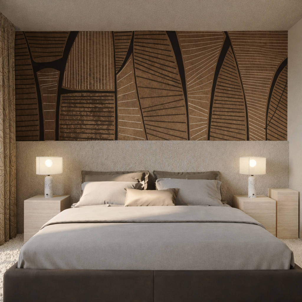 A refined interior defined by soft architectural lines and a warm, earthy palette. Natural stone, rounded forms, and rich wood accents create a calm yet expressive atmosphere.